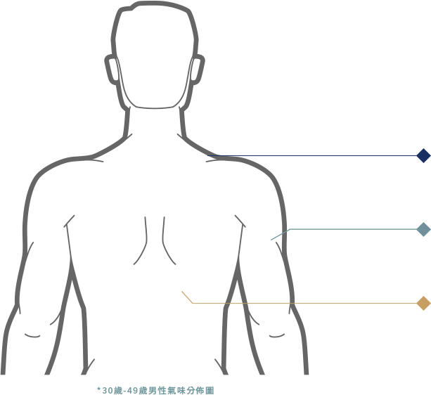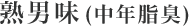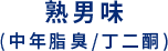 氣味最強烈的時間在35~50歲後半,汗水中的乳酸被皮膚常駐菌代謝後產生「丁二酮」,再和皮脂中的「中鏈脂肪酸」混合後,散發獨特油垢味-熟男味,好發於後頸部、後頭部與頭頂部。